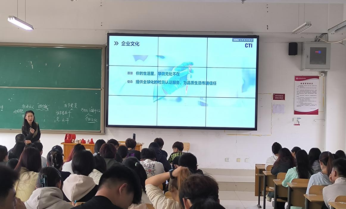 为深化校企合作,拓宽学生实习与就业渠道,2026年4月14日,华测检测认证集团股份有限公司校园专场宣讲会在7教505教室成功举办,食品检验检测技术专业全体学生参与本次活动。