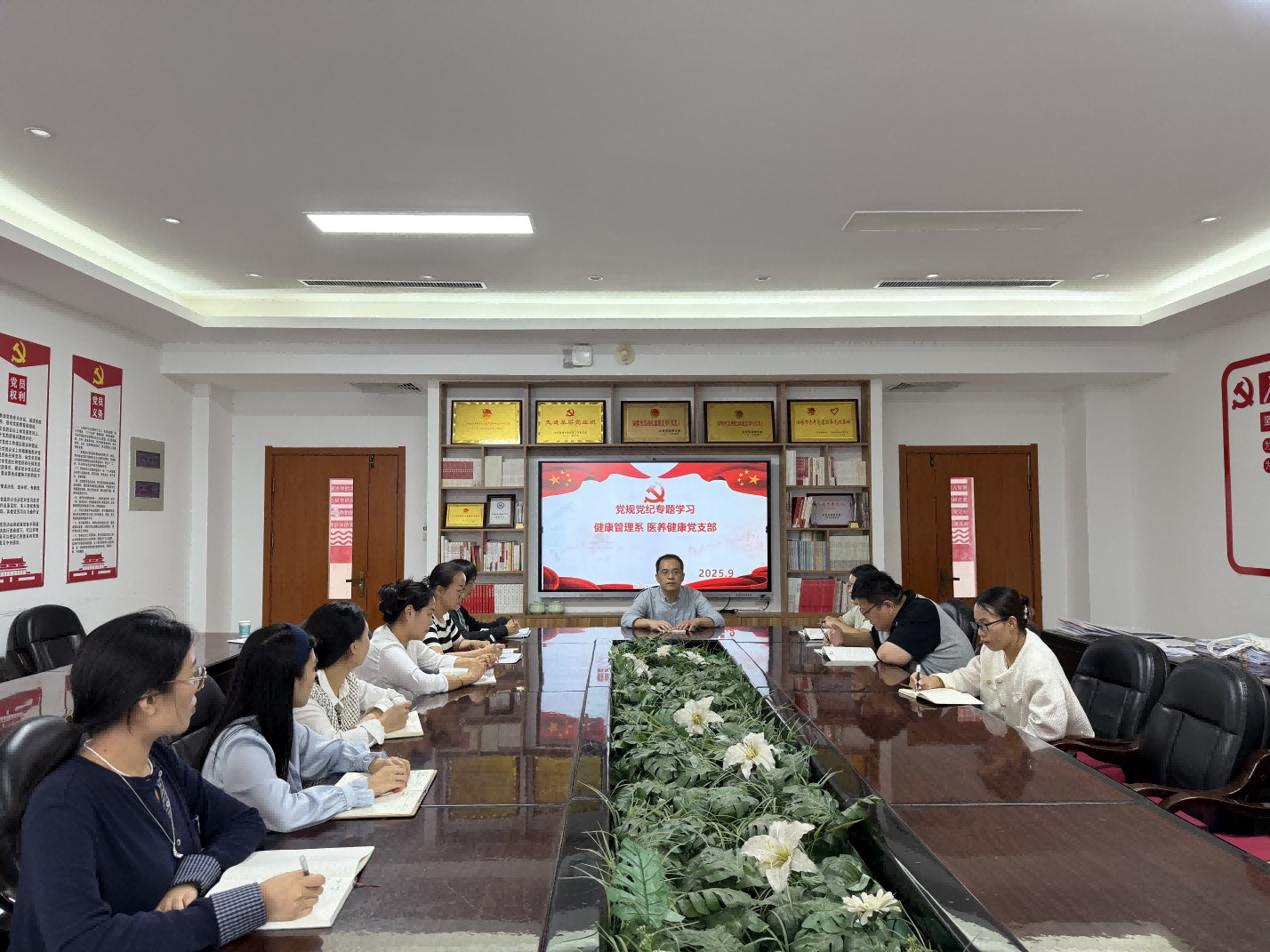 2025年9月28日,为深入贯彻落实全面从严治党要求,进一步加强党员纪律建设,提升党员政治素养和纪律意识,健康管理系医养健康教研室党支部组织开展党规党纪专题教育学习活动,孙海南书记主持会议,支部全体党员参会。