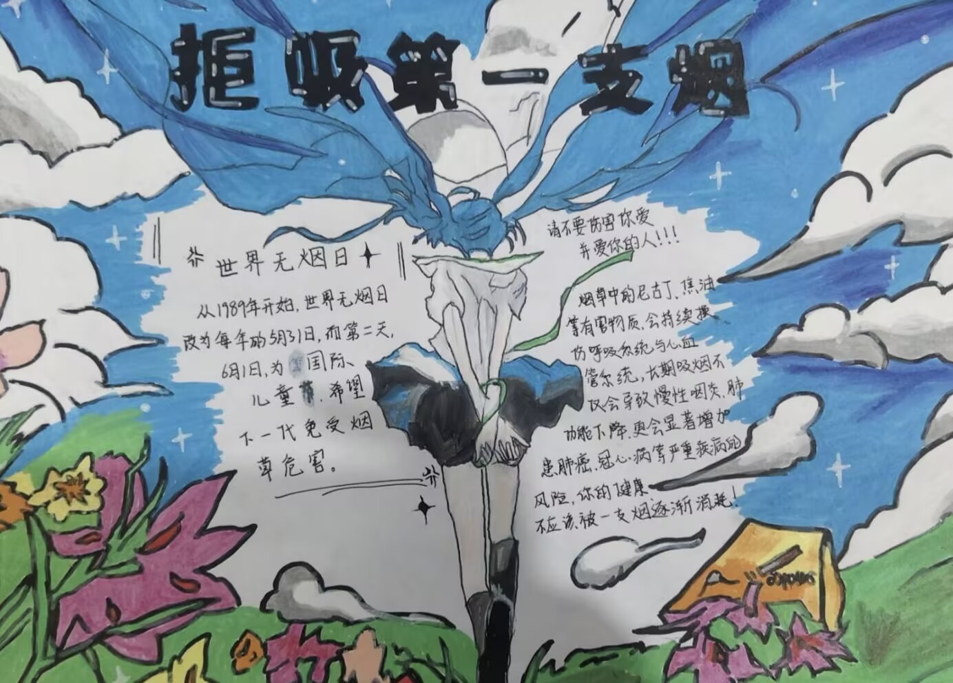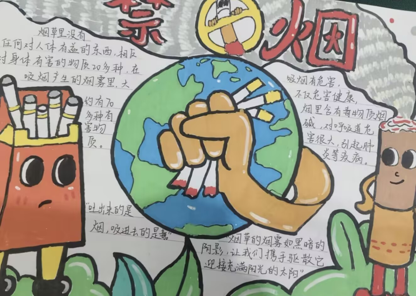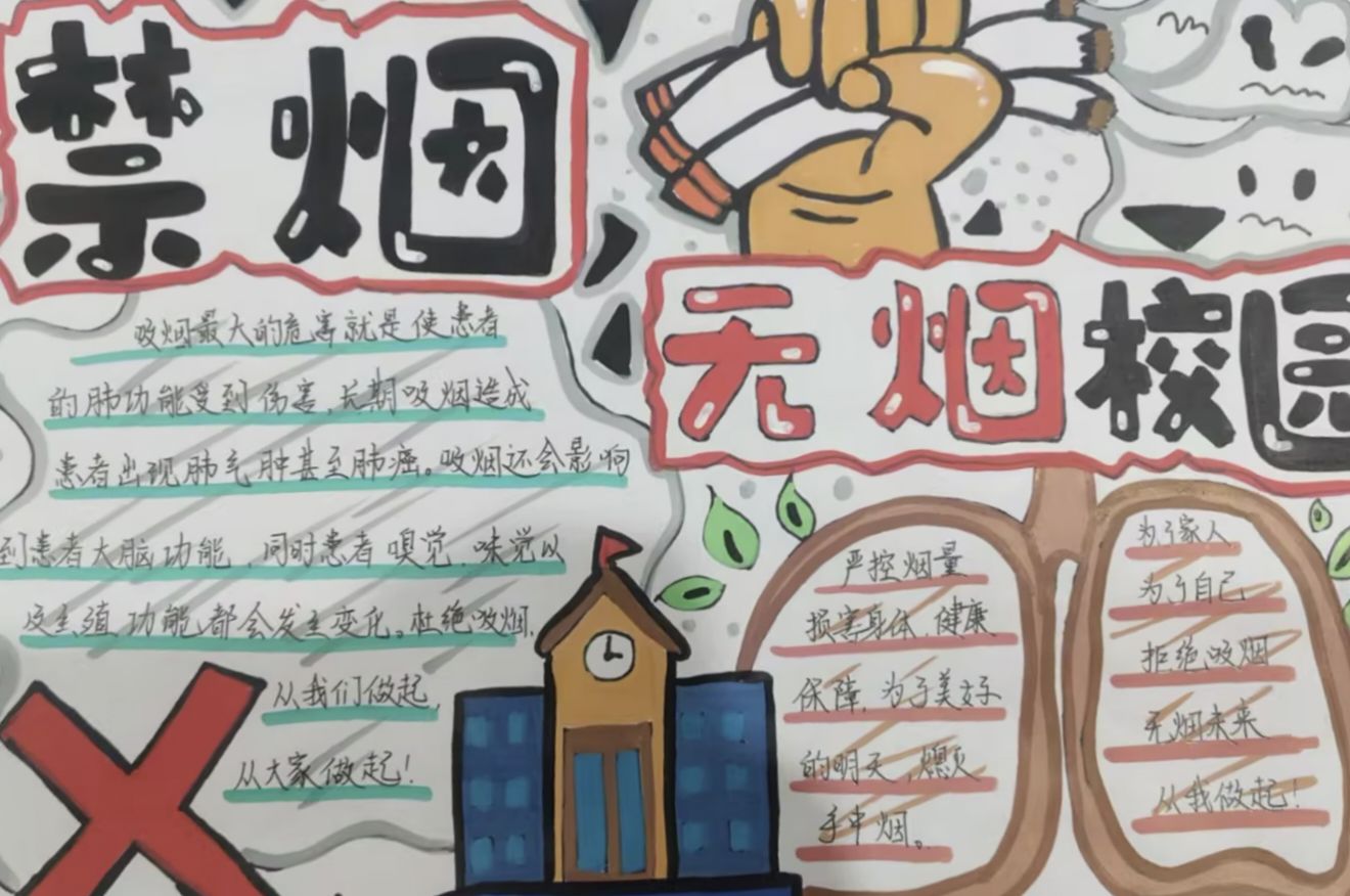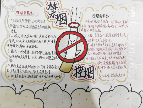 手抄报征集则以“笔”为媒传递态度。健康管理系面向全体学生发起征集,同学们围绕“烟草危害”“无烟校园”“青春与健康”等主题,融合科学知识与艺术创意进行了创作。优秀作品展出后,吸引众多学生驻足,成为校园里“无声却有力”的禁烟宣传风景线。“绘制时查了很多烟草危害资料,越画越觉得远离烟草重要,也想提醒身边同学。”一名创作者说。
