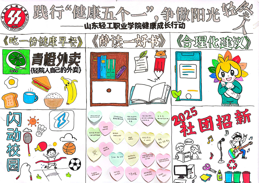 本次创作围绕“吃一份健康早餐、读一本好书、参与一项运动、加入一个社团、提一次合理化建议”的“五个一” 核心,学生们以专业视角结合生活场景,让健康与文明具象化:早餐主题作品里,“青橙外卖”搭配的鸡蛋、面包与粥品,标注着“吃饱早八才有力气”的俏皮文案,传递营养与秩序的食堂文明;阅读板块的画作中,图书馆共读、笔记摘抄的画面,呼应着“静读好书,涵养文明”的书香氛围;运动赛场的奔跑身影、社团招新的协作场景、建议信箱的互动设计,则将“主动参与、理性建言”的文明素养融入青春日常。画中鲜活的卡通形象、色彩明快的生活片段,既展现了健康习惯的细节,也流露着文明交往的温度。