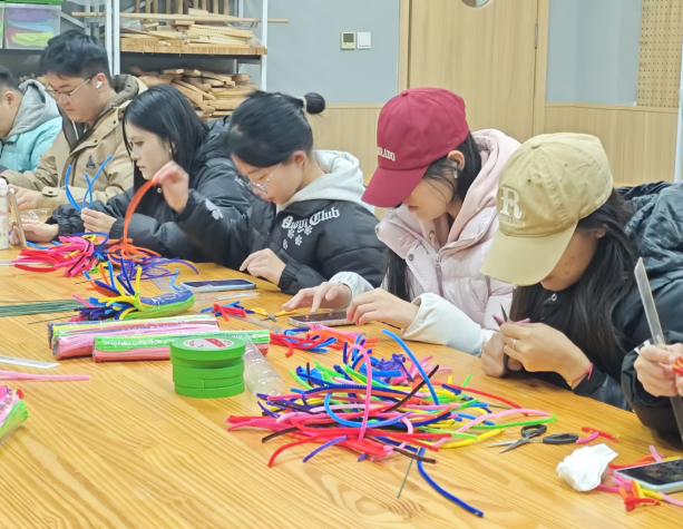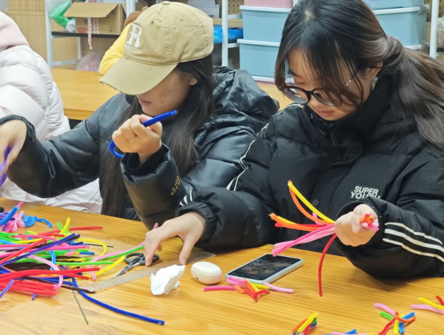 匠艺巧手工社开展了创意手工活动,以色彩缤纷的扭扭棒为材料,模拟烟花绽放的灵动形态。同学们通过缠绕、弯折、拼接等精细操作,将普通材料转化为形态各异的“烟花”艺术品。活动将传统手工艺术与创意美学巧妙融合,不仅锻炼了同学们的动手能力,更在协作互动中激发了创新思维,为校园增添了浓厚的艺术氛围。