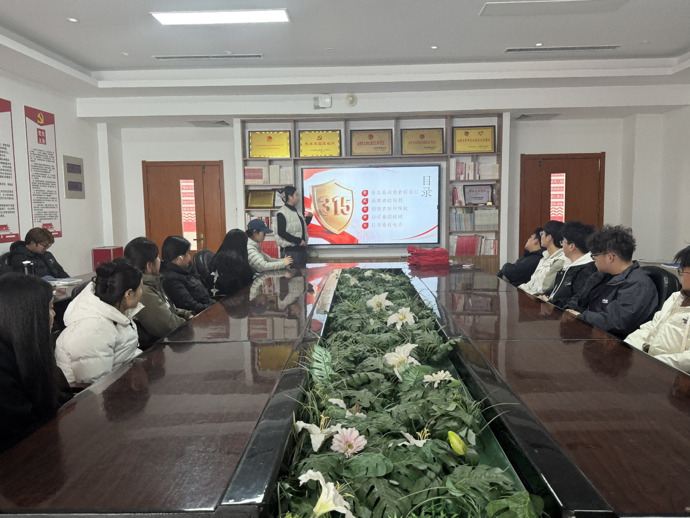 辅导员、学生干部及各班代表围坐交流,结合亲身经历分享消费困惑与维权心得。从虚假宣传到售后难题,同学们在热烈讨论中碰撞思想,将维权理念从“被动聆听”转为“主动思考”,凝聚起共筑诚信消费环境的青春共识。