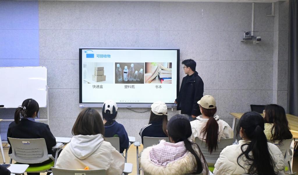 宣讲中,志愿者普及了垃圾分类知识,通过图文展示和互动问答,详细介绍了可回收物、有害垃圾、厨余垃圾和其他垃圾的分类标准与投放要求。同学们认真聆听,积极互动,进一步加深对垃圾分类重要性的认识。