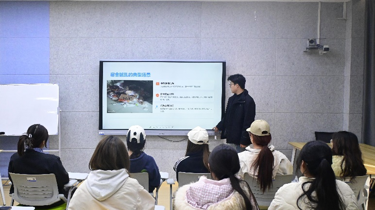 活动现场,学生志愿者围绕“垃圾需带下楼、勿堆放在宿舍”这一主题,结合真实案例,播放同学们日常宿舍垃圾堆放的实景照片,深入浅出地讲解垃圾堆积在楼道或宿舍内带来的多重危害。志愿者指出,垃圾长期堆放不仅容易滋生细菌、蚊虫,引发呼吸道疾病和皮肤病等健康问题,还存在严重的消防安全隐患,一旦发生意外,将阻碍逃生通道,威胁生命财产安全。