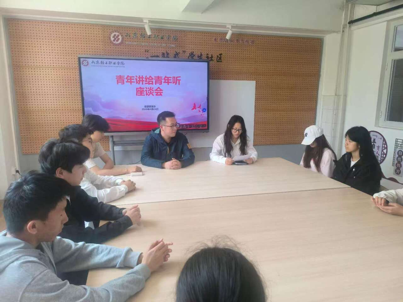 为深入推进全环境立德树人,发挥青年榜样的示范引领作用,搭建青年学子交流成长、互学共进的平台,4月24日,健康管理系“轻听”系列活动特辑之“青年讲给青年听”主题座谈活动在轻舍之家开展。本次活动邀请淄博市优秀共青团员、23级食品检验检测技术专业学生周祥宇分享成长经历,健康管理系轻锋社教师李荣昭与10名轻青社学生参与座谈。